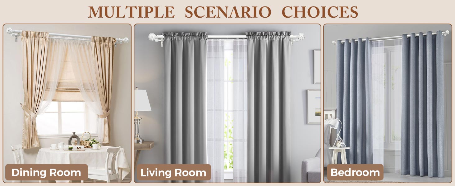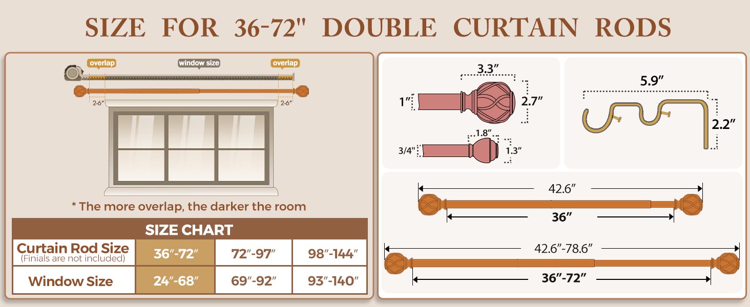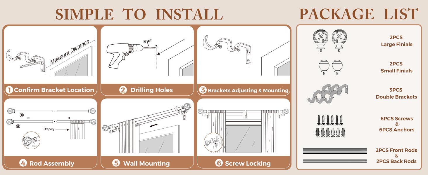 • MORE OPTIONS & EASY TO INSTALL - 2 sizes and 5 colors are available to meet your different needs. The rod set packed with 1 set of front rod(2pcs rods), 1 set of back rod(2pcs rods), 2 sets of two finials in an antique bronze and all mounting hardware for easy installation, including double brackets, screws, drywall anchors and instructions.